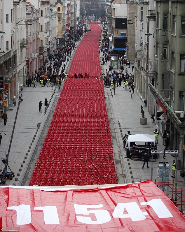 Η μαύρη επέτειος συμπλήρωσης 20 χρόνων από την έναρξη του πολέμου (6 Απριλίου) τιμήθηκε με τέτοιο τρόπο ώστε όποιος κοιτούσε από ψηλά να νομίζει ότι κυλά ένα κόκκινο ποτάμι αίματος στην καρδιά της πόλης.