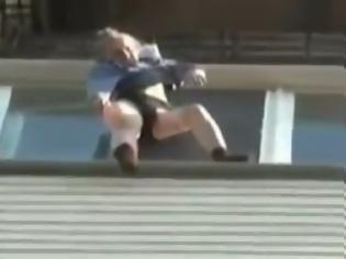 ‘Όμως, γλίστρησε στα κάγκελα με αποτέλεσμα να πέσει στο κενό! Η τυχερή γυναίκα έμεινε “κολλημένη” στον 7ο όροφο, να αιωρείται στον αέρα αφού το φόρεμα της πιάστηκε από ένα εξόγκωμα!